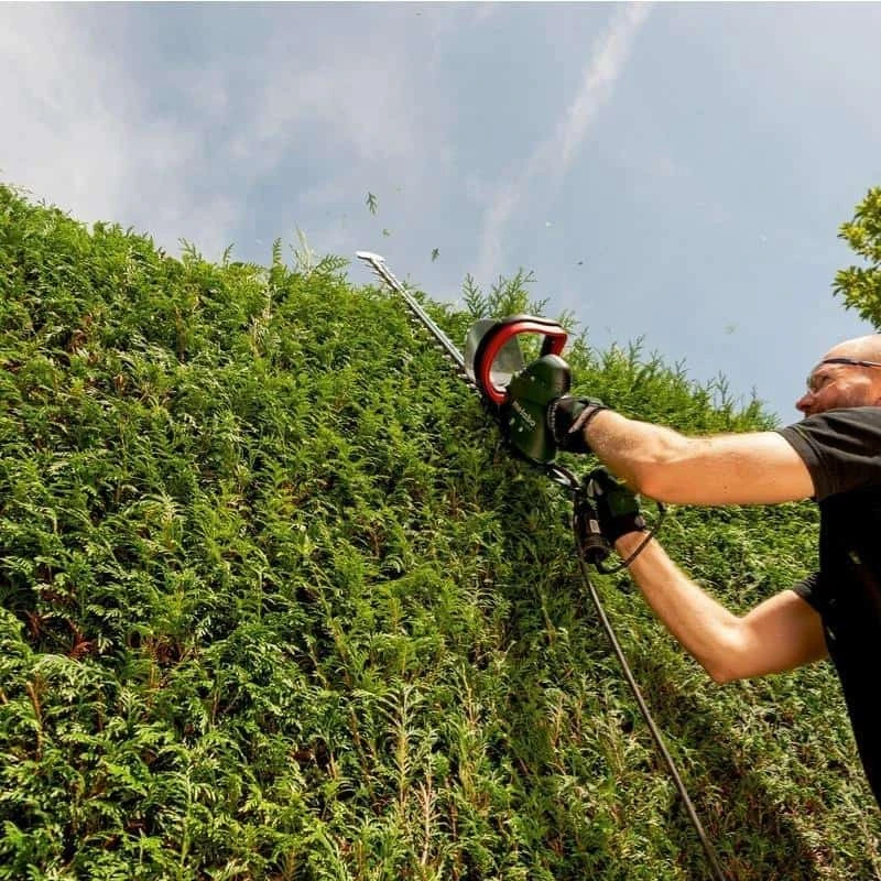Le taille haies HS8755 de Metabo offre une coupe propre et élevée grâce à ses dents de lame diamantées et son réducteur à deux vitesses.